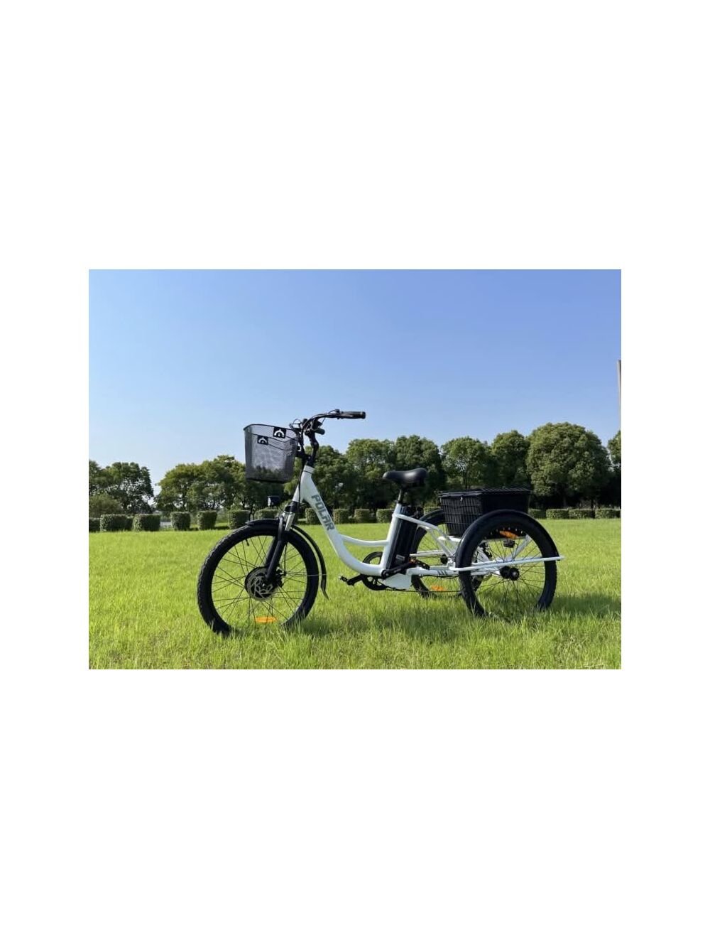 Sykkelen har 7 gir og 5 ulike hastigheter. Du kan kombinere pedaler og motor eller kun benytte motorkraft. Sykkelen kommer med en kraftig 500W motor, avtagbart litium batteri og rekkevidde på hele 50 km pr lading. (Rekkevidden beror på vekt på fører samt underlag og stigning.) Med i pakken følger kurv som festes til styret ,solid bagasjekurv bak på sykkelen, ringeklokke, ledlys foran og bak, skjermer samt refleker på alle hjul. Denne elektrisk trehjulssykkelen er meget stødig og har godt med bagasjeplass tatt i betraktning at det er en elsykkel. Elsykkel med 3 hjul er praktisk om en trenger økt balanse, ekstra hjelp i bakker og med fremdriften. Elektrisk sykkel med 3 hjul er utstyrt med skivebremser foran og skivebremser bak for ekstra god bremsekraft.