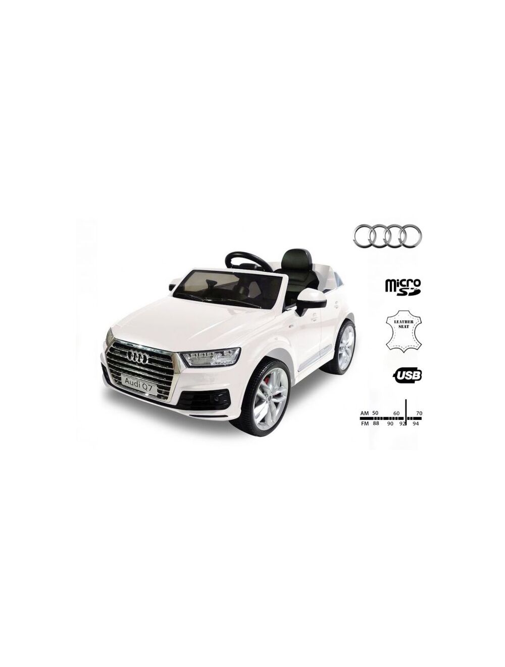 Denne tøffe SUV-modellen er utstyrt med bl.a. innebyggd bilstereo med noen forhåndslagrede låter og tilkoblingsmulighet til MP3-spiller slik at ditt barn kan spille alle sine favorittlåter (eller dine). Tre hastighetstrinn finnes som gjør at bilen kan tilpasses til kjøreferdigheter. Med fjernkontrollen velger du som forelder bilens hastighetstrinn, og du kan når som helst ta over kontrollen samt nødbremse. Denne romslige og moderne Audi Q7 er laget for et barn og har et behagelig sete i kunstlær med sikkerhetsbelte. Bilen har også dekk i en mykere gummiblandning og individuell støtdemping på samtlige hjul - alt for å oppnå økt kjørekomfort! Videre er bilen utstyrt med girspak og flere tøffe detaljer på instrumentpanelet for å få følelsen av en ”ordentlig bil”. med bakspeil, LED-lamper framme samt baklykter med tøft, rødt LED-lys. Når bilen startes kommer realistiske lydeffekter. Oppsummert gir dette garanterat ditt barn en skikkelig råkul opplevelse!