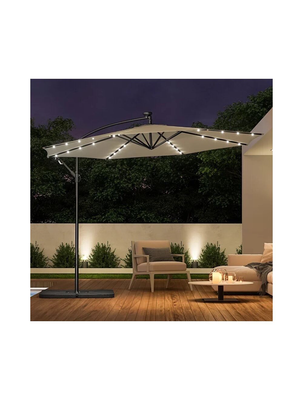 | Description | Hengeparasollen med Led lys gir optimal solbeskyttelse på dagtid og er en flott lyskilde om kvelden. Denne 300 cm store og elegante parasollen gir skygge og atmosfærisk lys om kvelden med sine 32 LED-lamper. Den er enkelt å betjene med sveiv. 32 LED-lamper med av / på-bryter